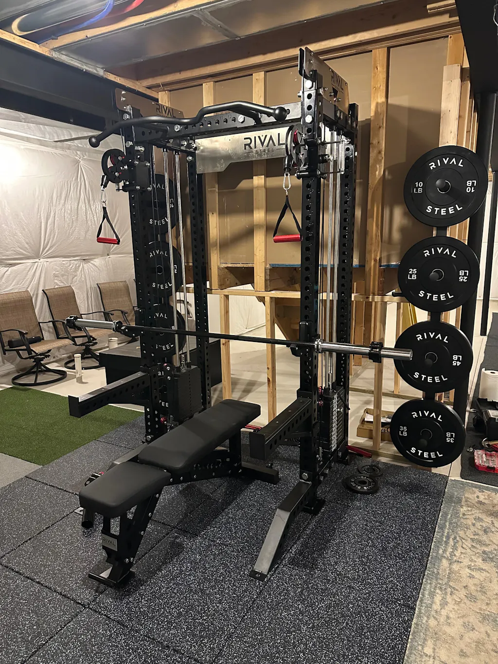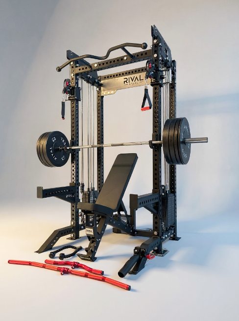 RIVAL Rapture - 3"x3" 11-Gauge functional trainer. The Rapture features smooth red anodized aluminum pulleys, commercial grade construction, and a plethora of included red anodized aluminum attachments. Lift big in tight spaces with our built in dual 154lb metal weight stacks (1:1 pulley ratio) meaning pulling 154lb feels like 154lb. Our quick-adjust pop-pin trolleys glide on commercial grade rollers to help keep your uprights sleek and safe.